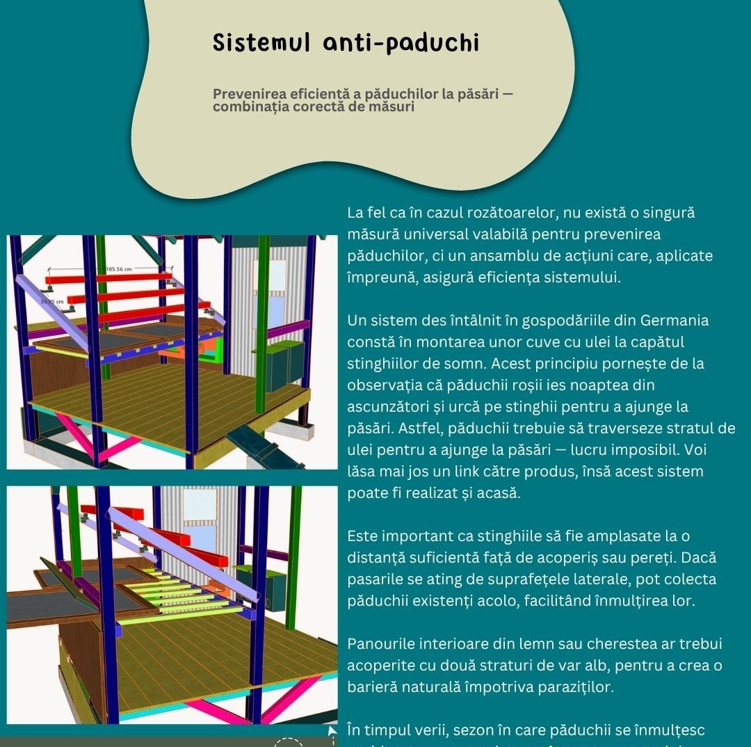 💧 Un sistem anti-paduchi inspirat din gospodăriile germane presupune montarea unor cuve cu ulei la capătul stinghiilor de somn. Acest principiu pornește de la observația că păduchii roșii ies noaptea din ascunzători și urcă pe stinghii pentru a ajunge la păsări. Stratul de ulei acționează ca o barieră fizică eficientă, împiedicându-i să înainteze.